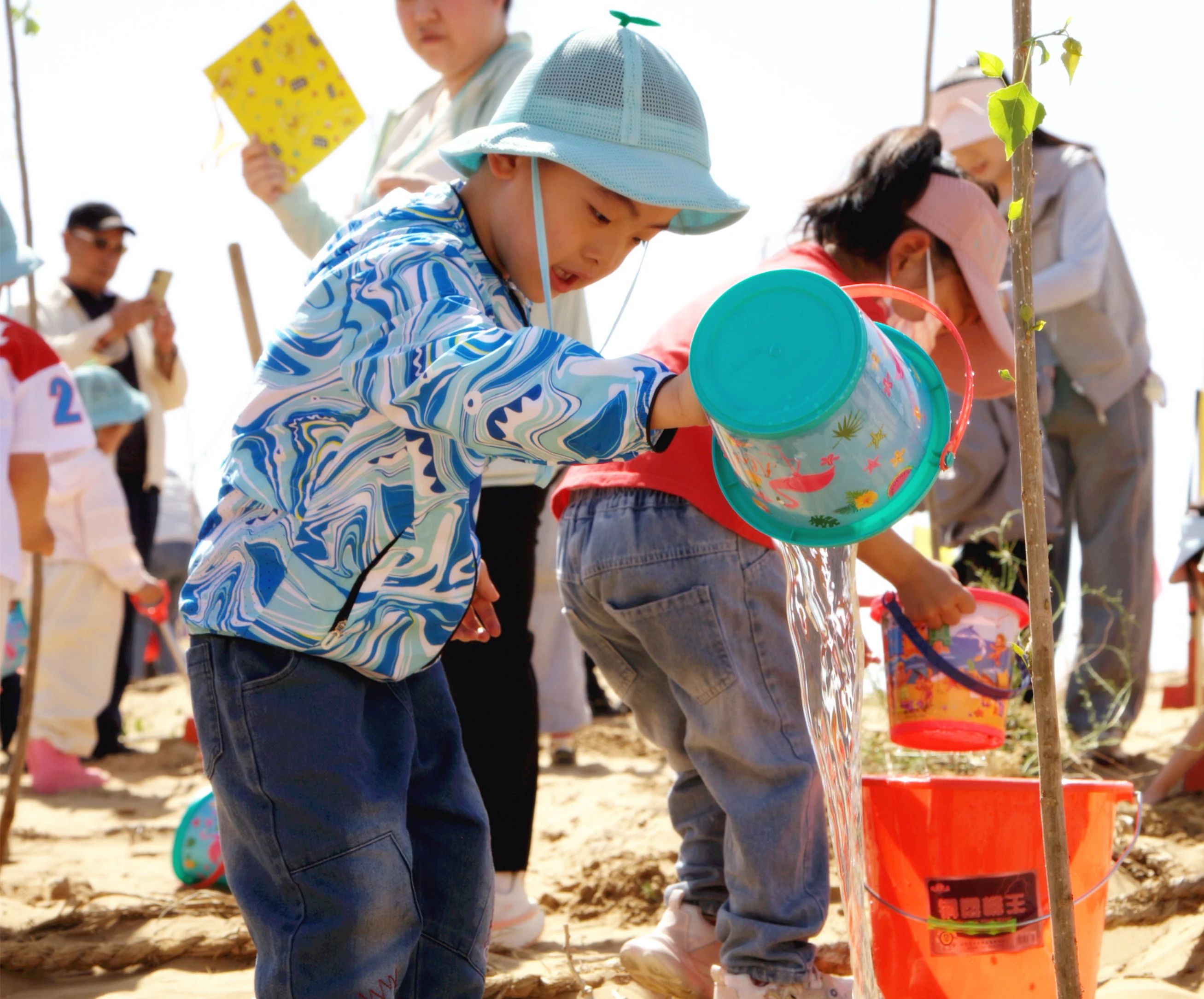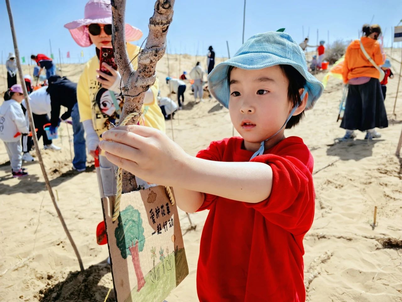 11时左右,种完的小树整齐地立在沙丘上。孩子们用彩色丝带在树苗上系上心愿卡:“爱护花草,一起行动”“花草树木,我们保护”……微风吹过,丝带在阳光下飘动,仿佛无数绿色的小手在挥舞。